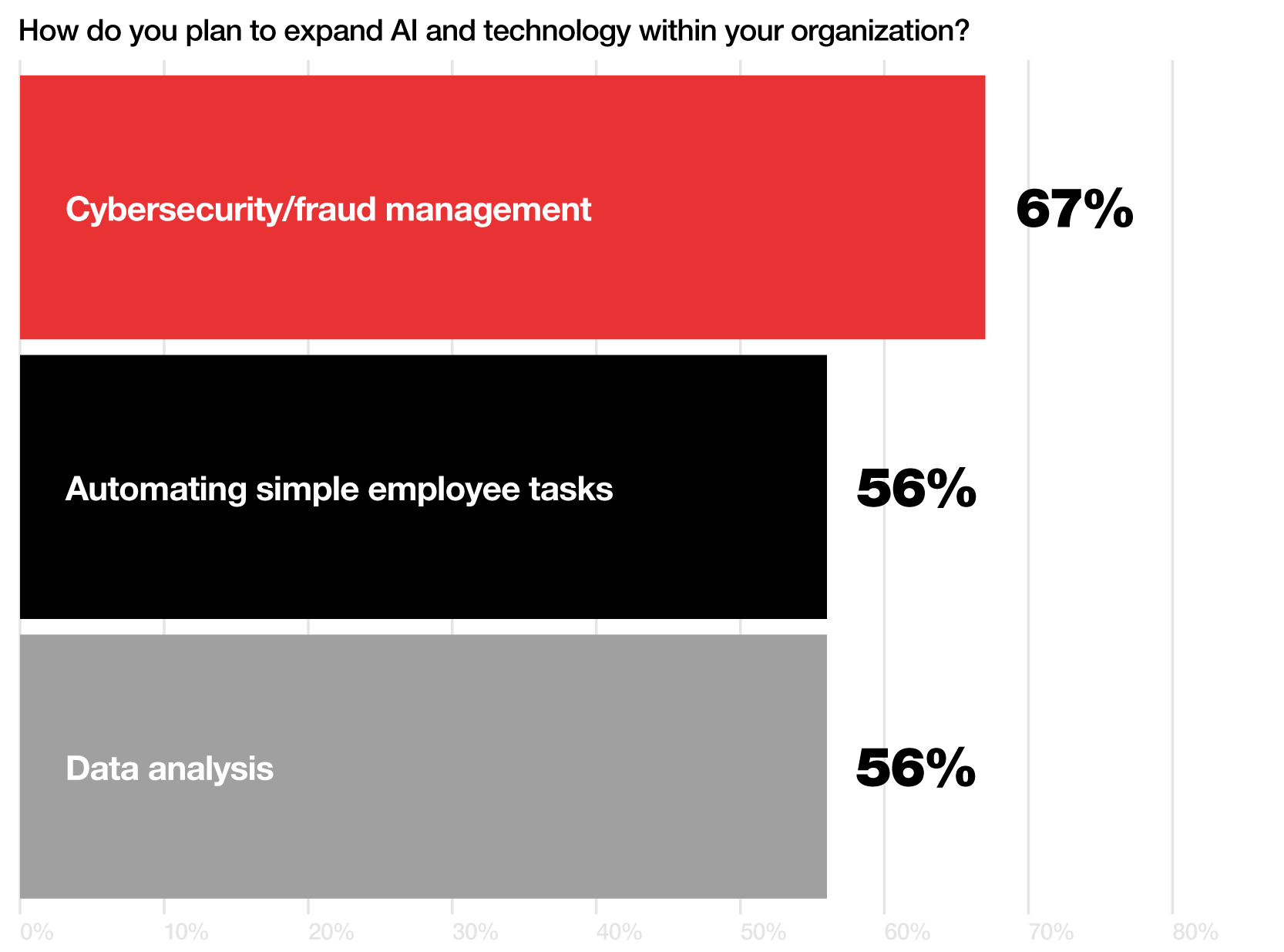 Middle market leaders are making deliberate, results-oriented AI investments focused on solving real business challenges and driving value. Currently, 67% are directing AI dollars toward cybersecurity and fraud mitigation, while 56% are automating routine tasks and improving data analysis.