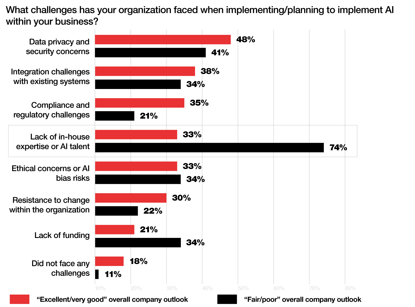 Among firms with a strong business outlook, nearly half of executives cite data privacy and security concerns as their top AI challenge, followed by 38% who face integration issues and 35% who struggle with legacy system compliance.