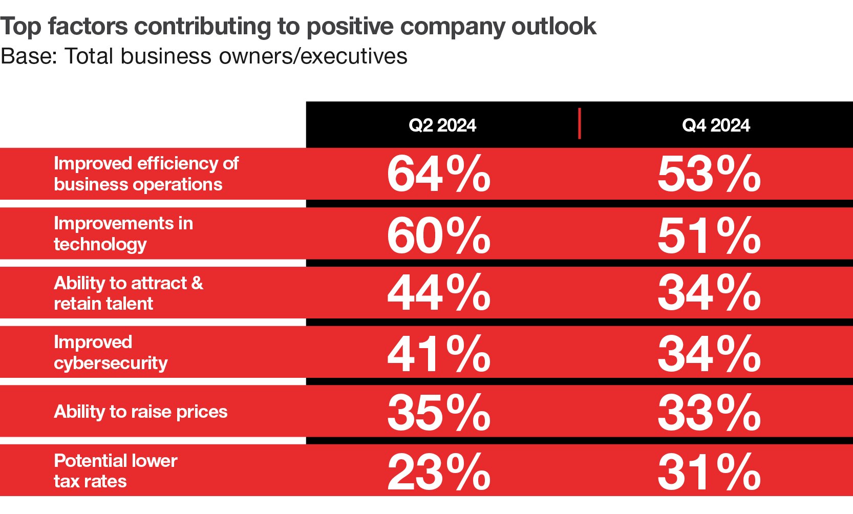 Among business leaders with a positive company outlook, the top three contributing factors (although down from the second quarter of 2024) remained improved efficiency of business operations, improvements in technology, and the ability to attract and retain talent. Additionally, the number of respondents citing potential for lower tax rates (31%) and the new political landscape (29%) increased significantly.