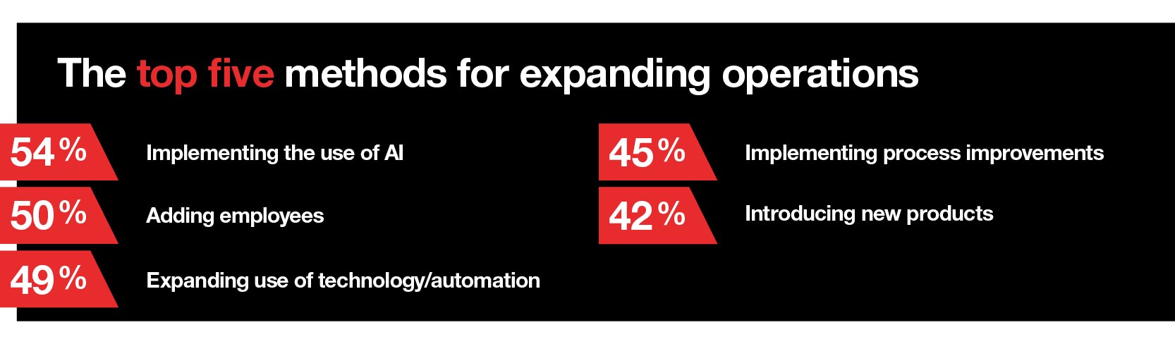 As middle market businesses grow, they’re embracing AI, technology, and research and development (R&D) — and hiring more workers to manage the expansion. Between 2022 and 2024, the share of middle market businesses employing 2,000 or more people increased from 16% to 20%, and the median number of full-time employees grew from 400 to 500. There was also a significant increase in the share of companies planning to expand the scope of their businesses through R&D.