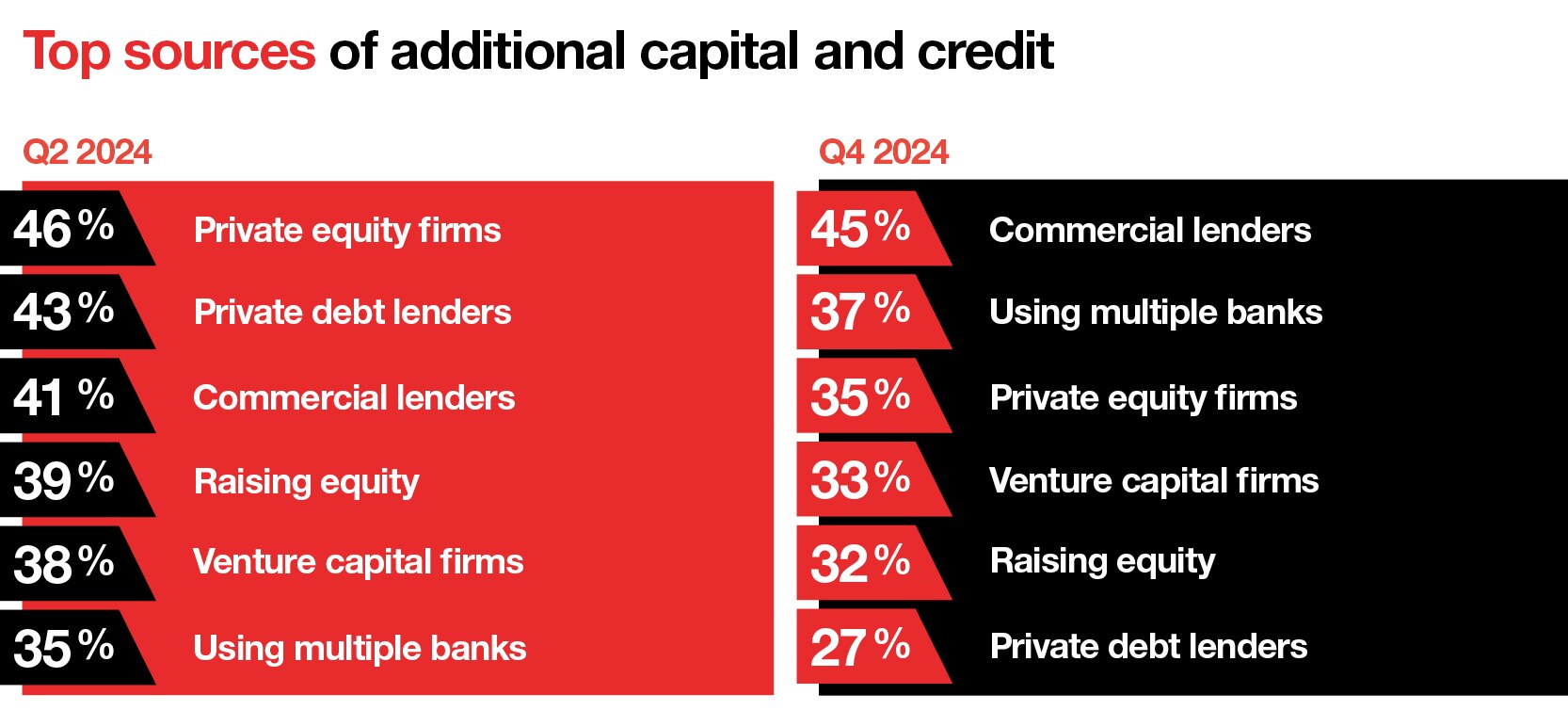 At the end of 2024, commercial lenders were the top source for middle market businesses seeking capital and credit. This represents a shift from six months prior, when private equity and private debt were the top two sources and commercial lending ranked third.