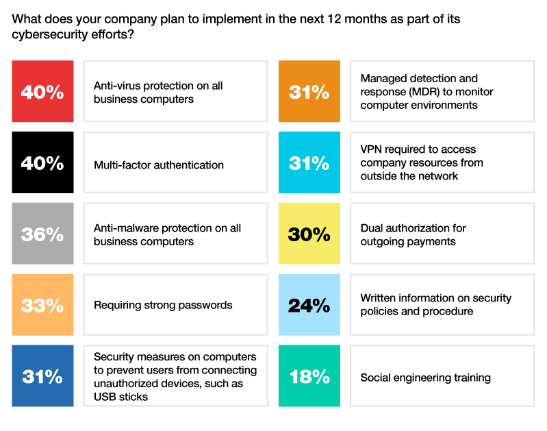 Survey findings show a concerning gap in organizations investing in employee training as a cybersecurity defense — a critical component in preventing breaches before they occur. Only 24% of companies plan to formalize written cybersecurity policies, and just 18% intend to provide training on social engineering threats.