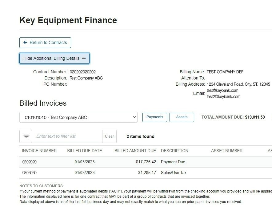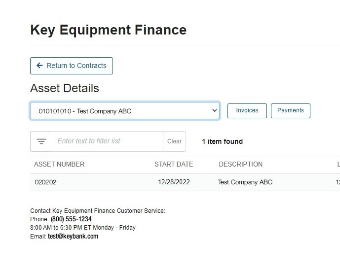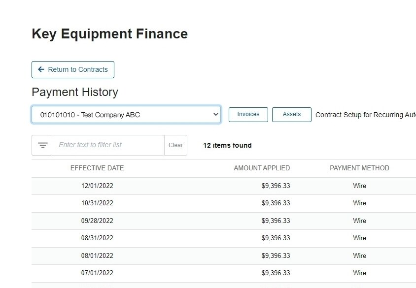 Key Equipment Finance information is viewable in KeyNavigator, see your active contracts, assets, billed invoices and payment history.