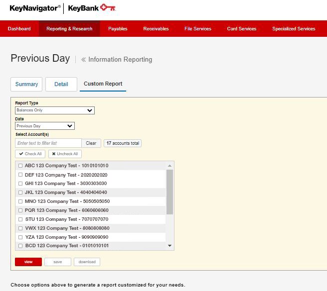 The previous day report can be customized and saved by using balance, transaction, and date filters.