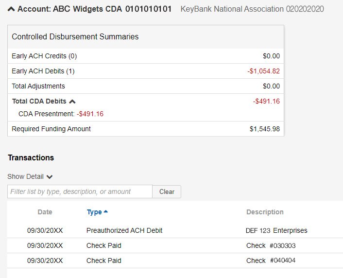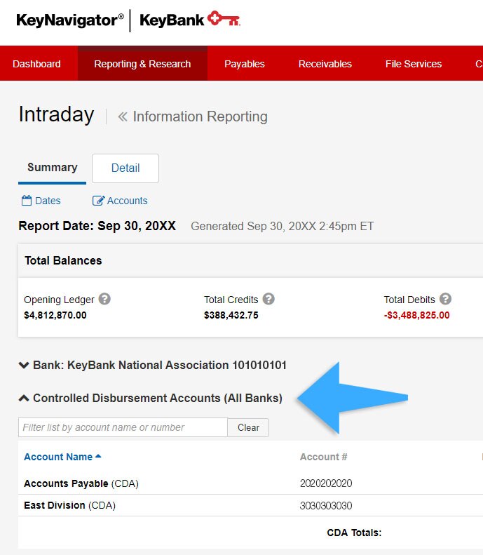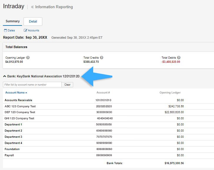 Intraday information includes all memo transactions from the current day, such as deposit activity, CDA funding requirements, incoming CDA checks, incoming ACH debits and credits, incoming wires, and ACH and wire transactions that you originate.