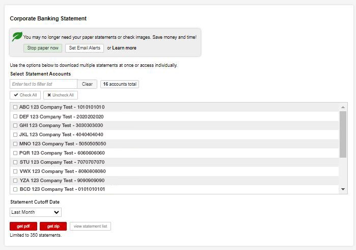 The Corporate Banking Statements segment allows you to view 24 months of bank statements for enrolled commercial accounts.