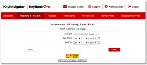 - Investments (AIS Sweep) Report Filter - Select an account and date(s), then click View.