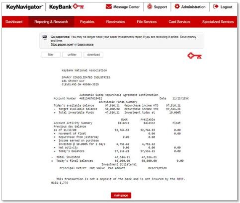 - Automated Repurchase Agreement Sweep provides a Daily Sweep Confirmation that displays the deposit account ledger and available balances, net transaction activity, the sweep target available balance, the sweep investment amount, the underlying investment security and daily, monthly and yearly income earned.